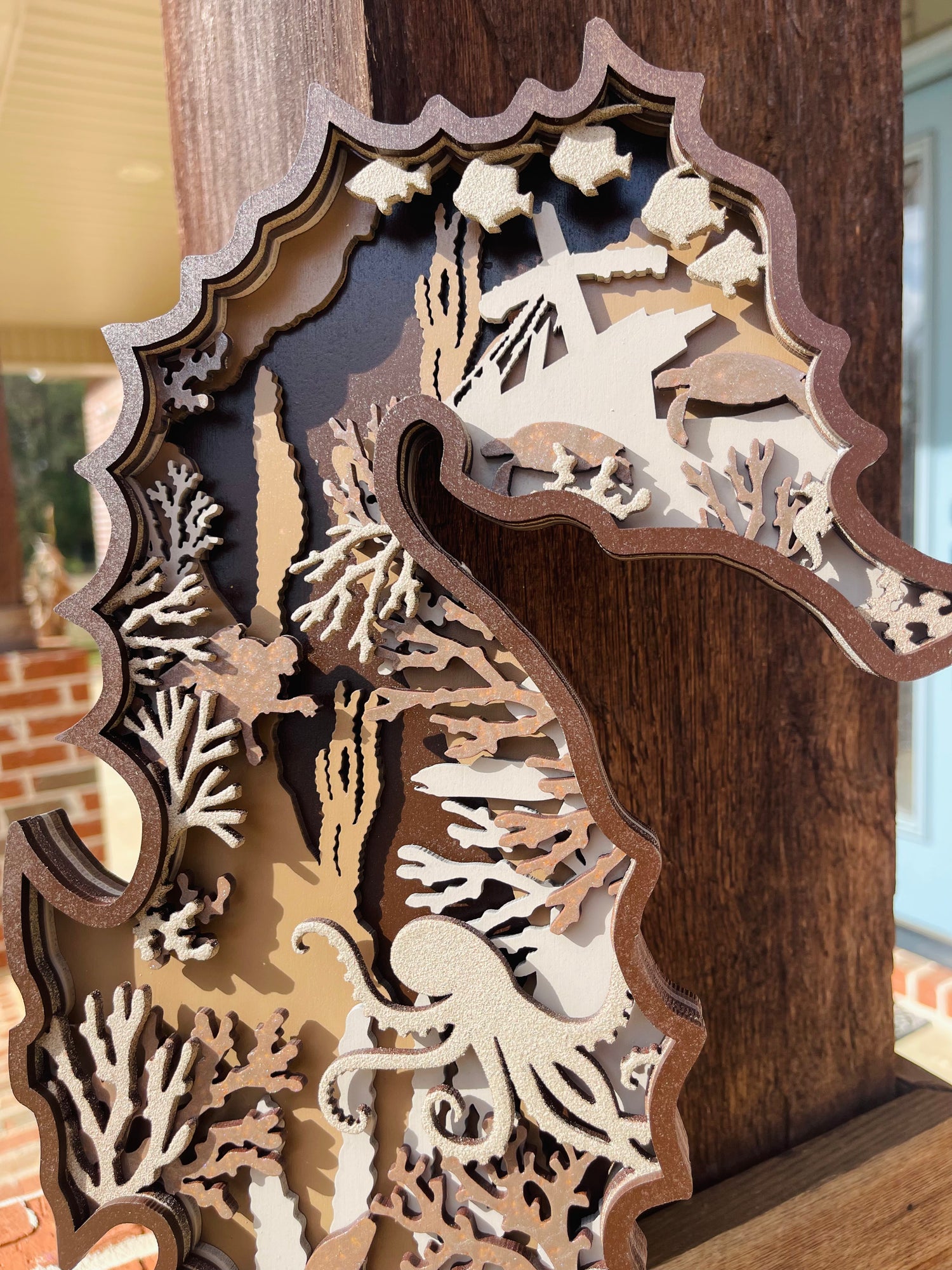 Discover the magical underwater world with this 6-layer “Under the Sea” Seahorse Mandala. Dive deep and explore the amazing marine creatures from fish, to scuba divers, octopuses, sea turtles, and ocean coral, all intricately crafted into a one-of-a-kind custom gift. Perfect for any ocean lover.