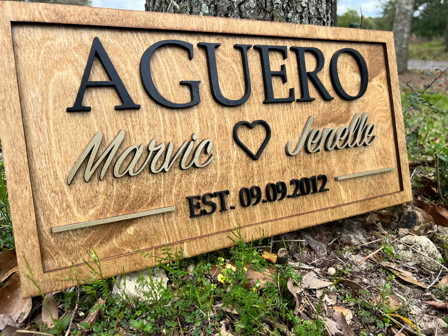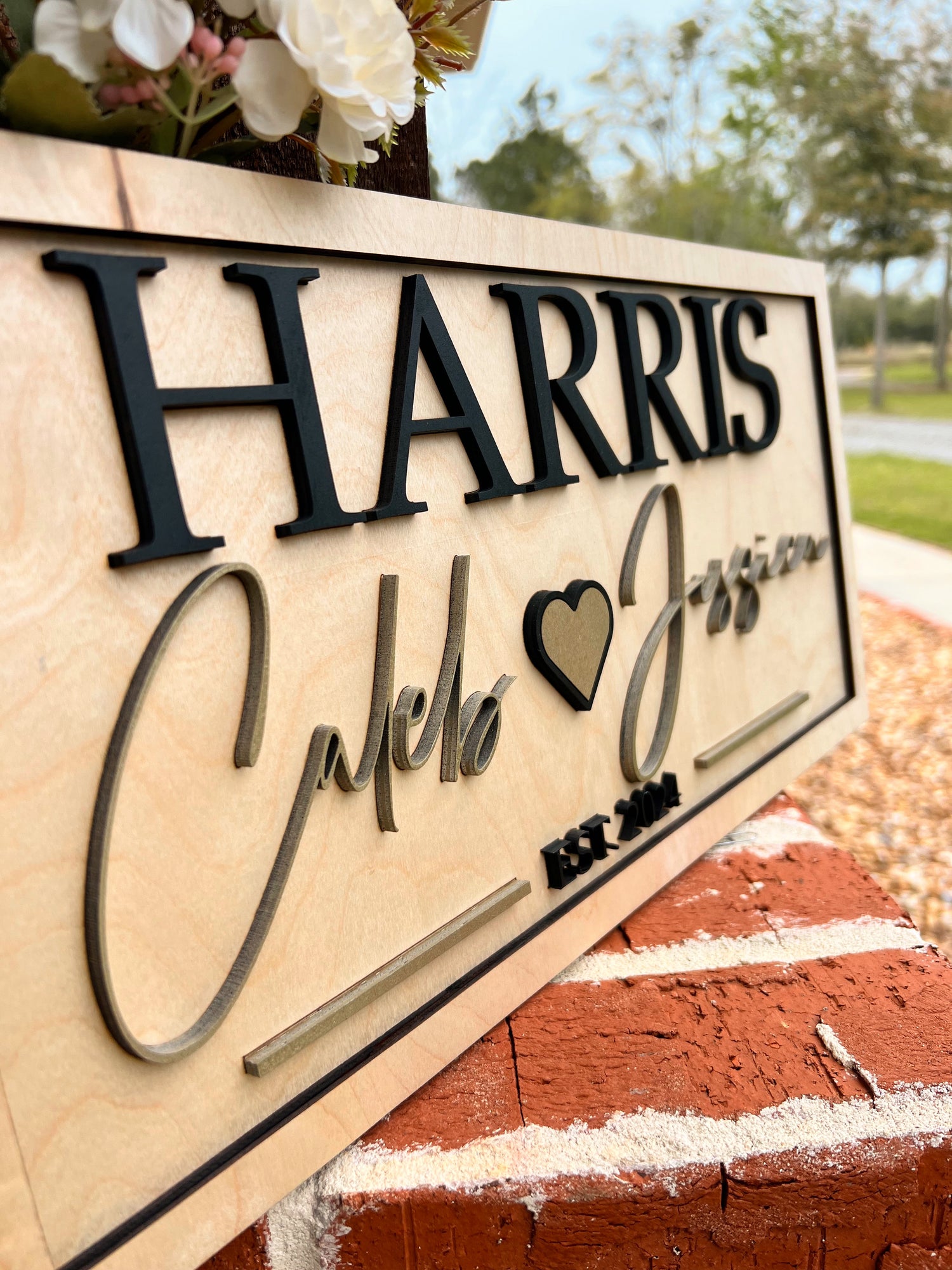 "Add some personality to your home decor with our Wedding/Anniversary/Name Gift. Made with Baltic Birch and stained oak, this piece features your custom names and established date, making it a perfect addition to any room. 3D lettering affect gives it that pop out look for an even more pop out look.