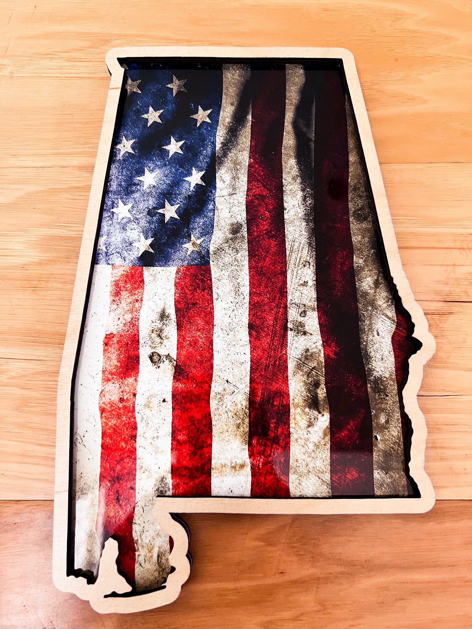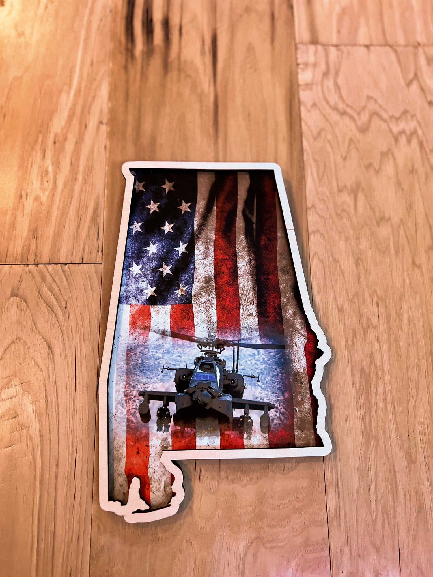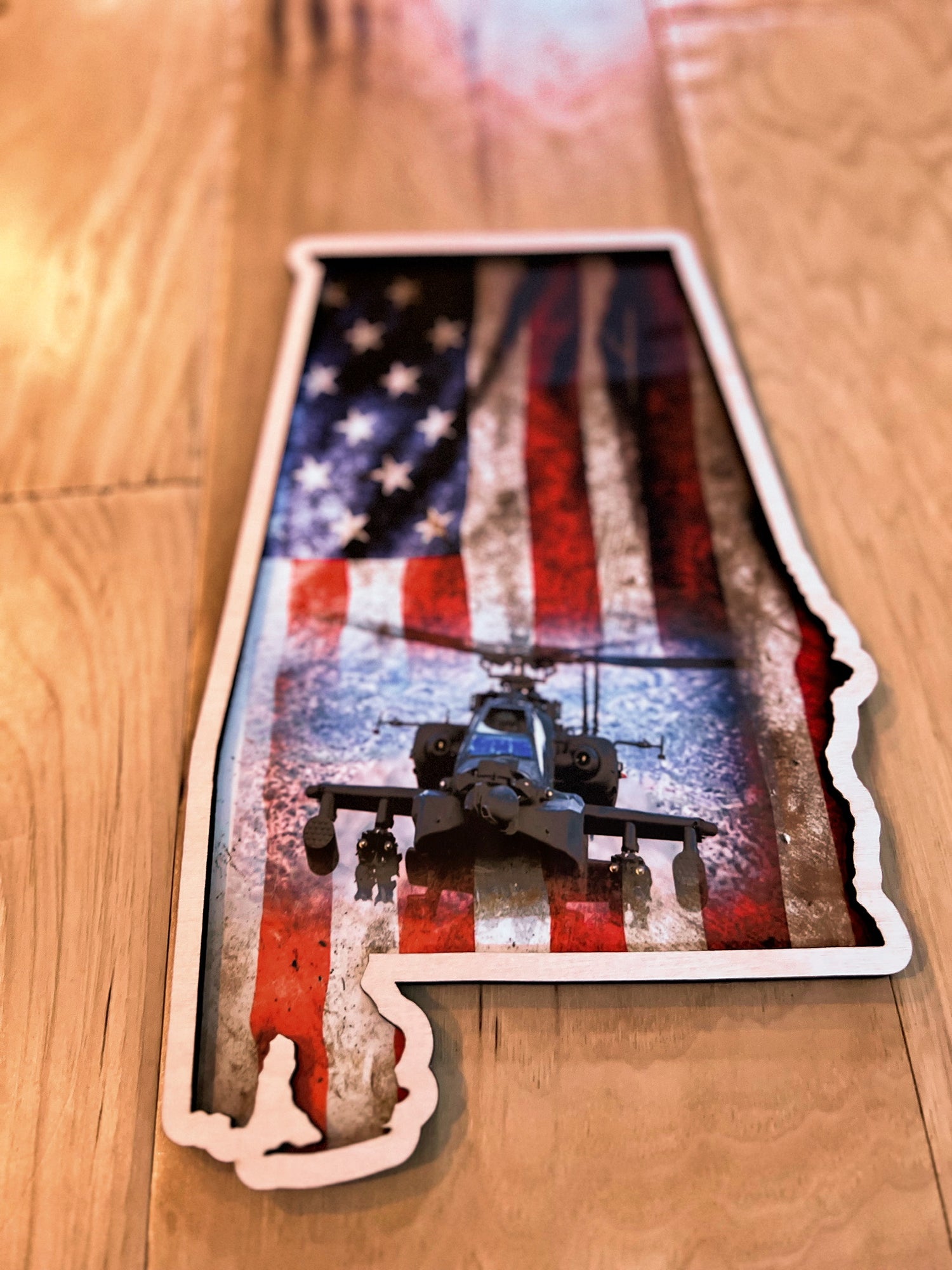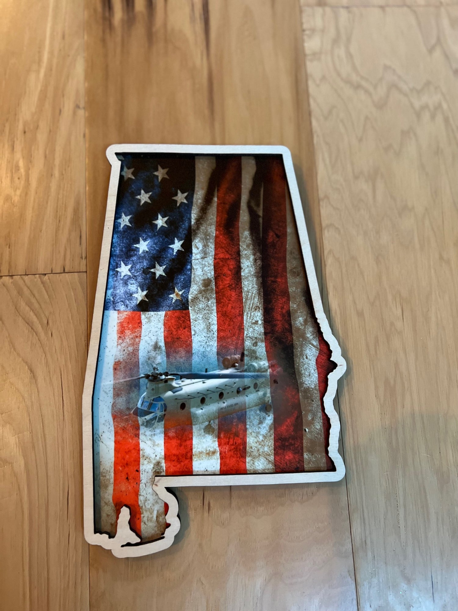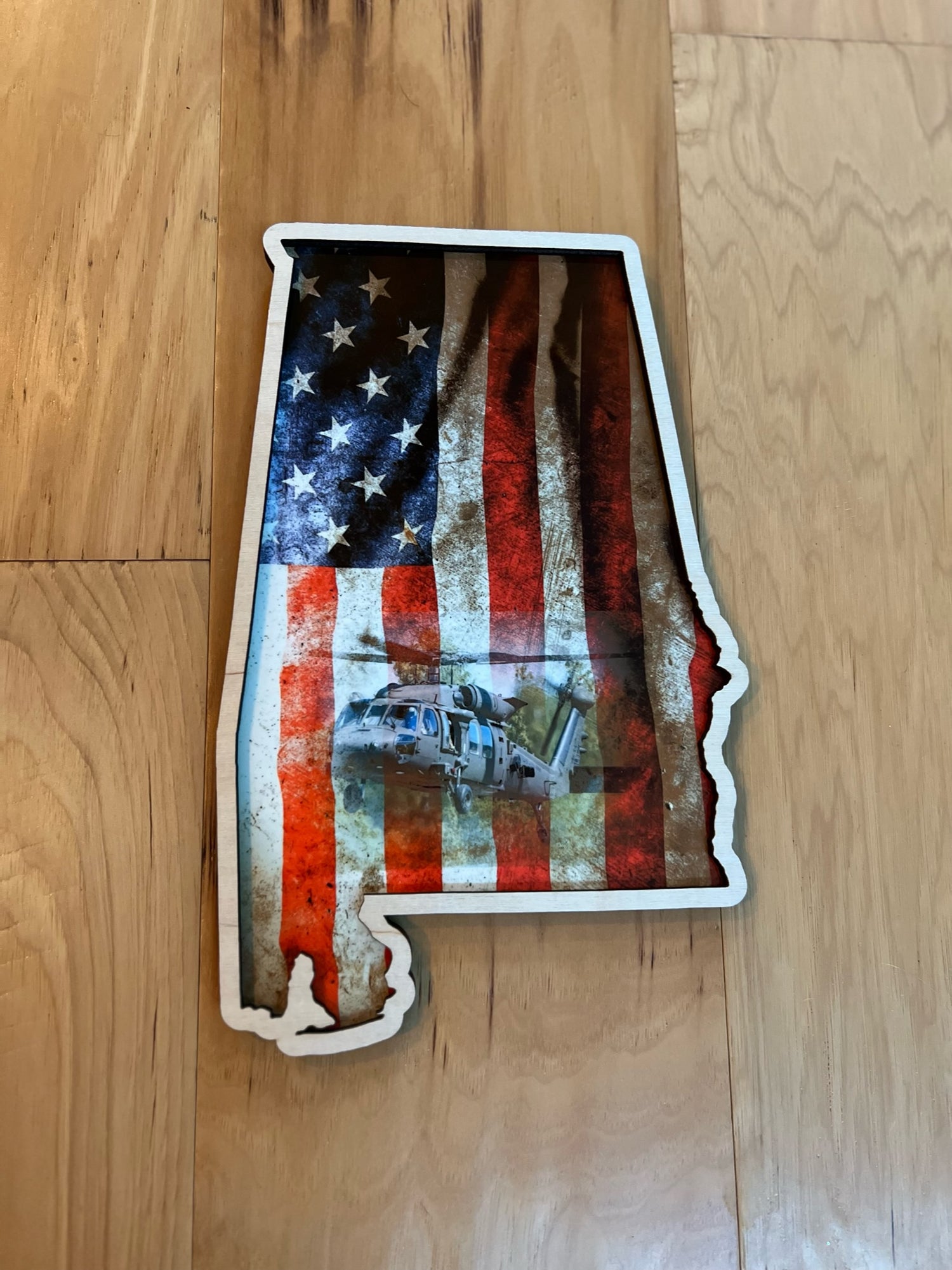 This Alabama State Helicopter Plaque is made from a solid wood base with a color sublimated cut-out of the state of Alabama and a helicopter. Appreciate this unique piece of art for its craftsmanship, durability, and vibrant colors.