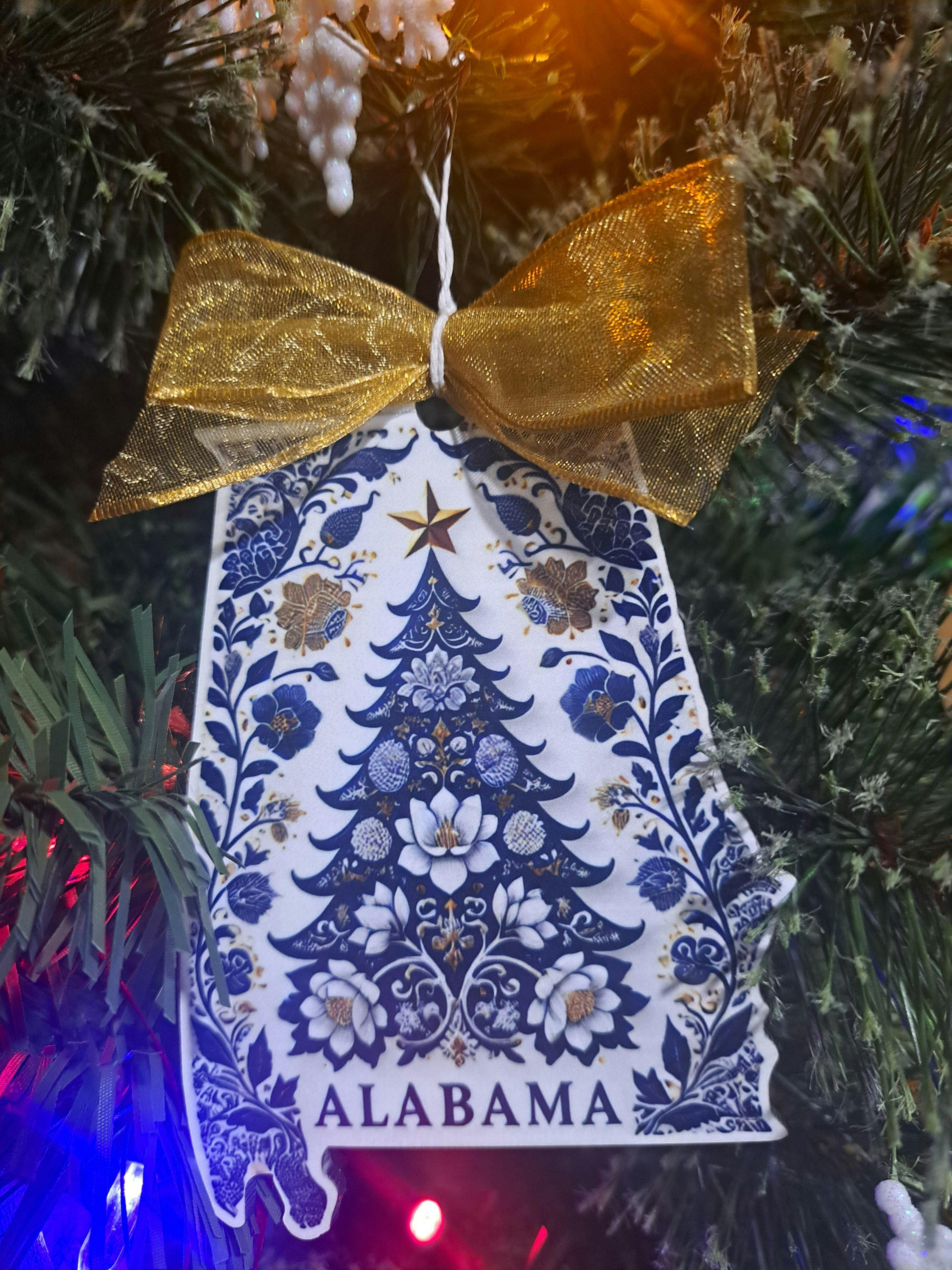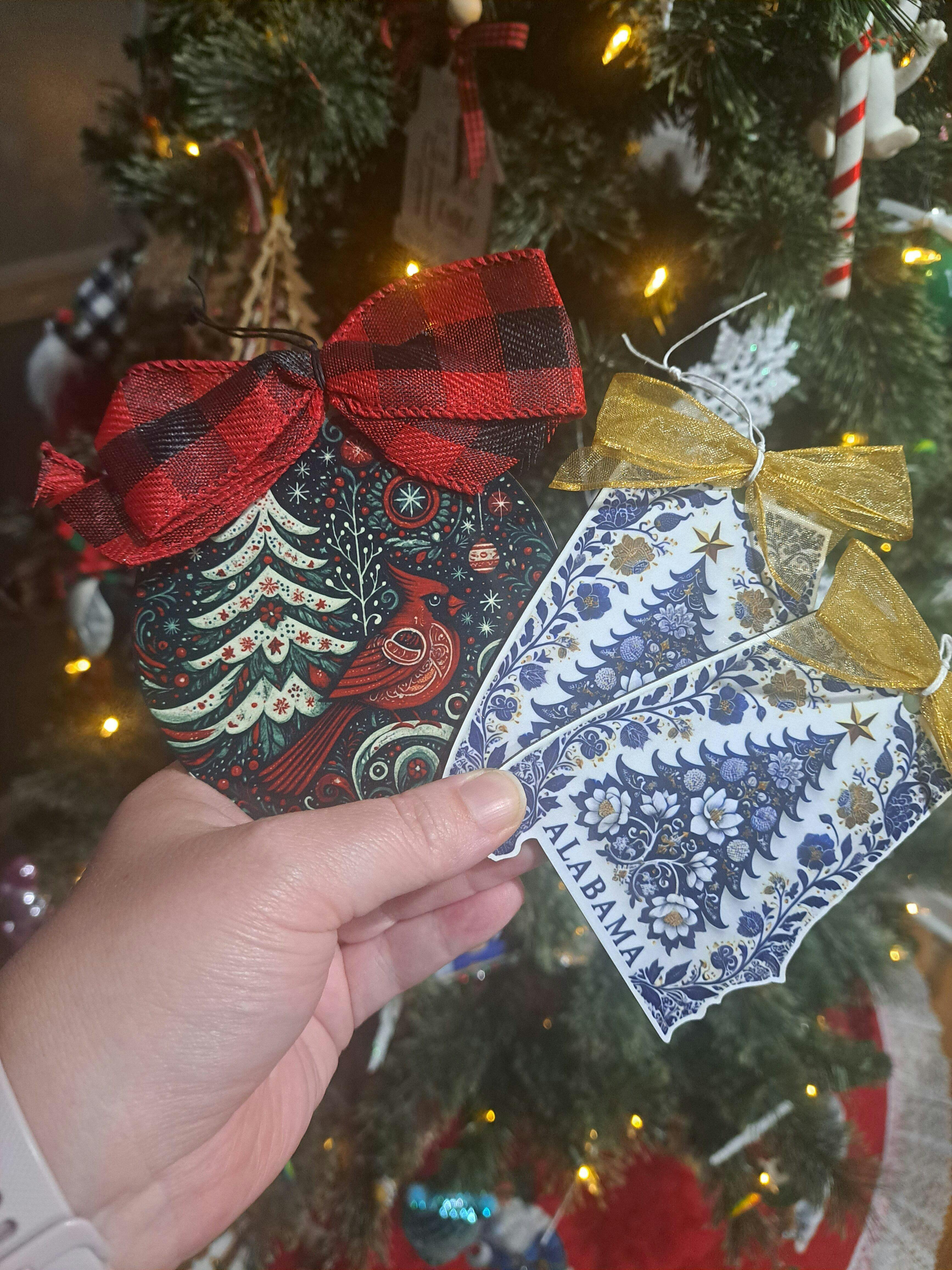 Disclaimer: Please note that some states feature sharp angles and small disconnected sections in their true outlines. To ensure durability and safe laser cutting, our ornaments are designed with slightly softened edges and may not perfectly replicate the exact state shape. We strive to maintain the closest possible resemblance to each state’s outline, though variations. Additionally, while some states may not accommodate tree placement inside the design, we consistently preserve the intended colors and style.