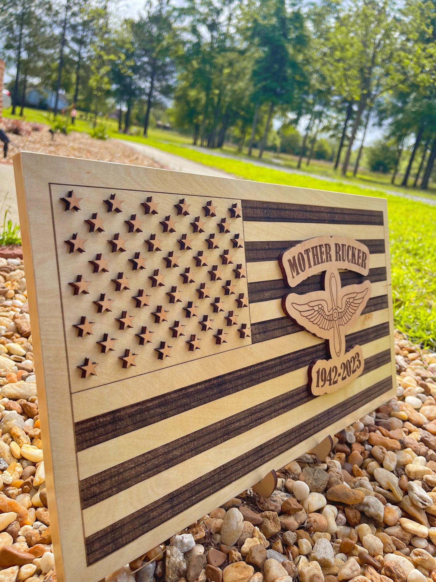 PERSONALIZED FLAGS: come with choice of aircraft or plaque placed on flag that you desire. This can be custom. This includes one plaque, name or aircraft only. Any added information after that will create a higher priced item. Message us for more info(send any picture references to office@avelwoodworking.com)
