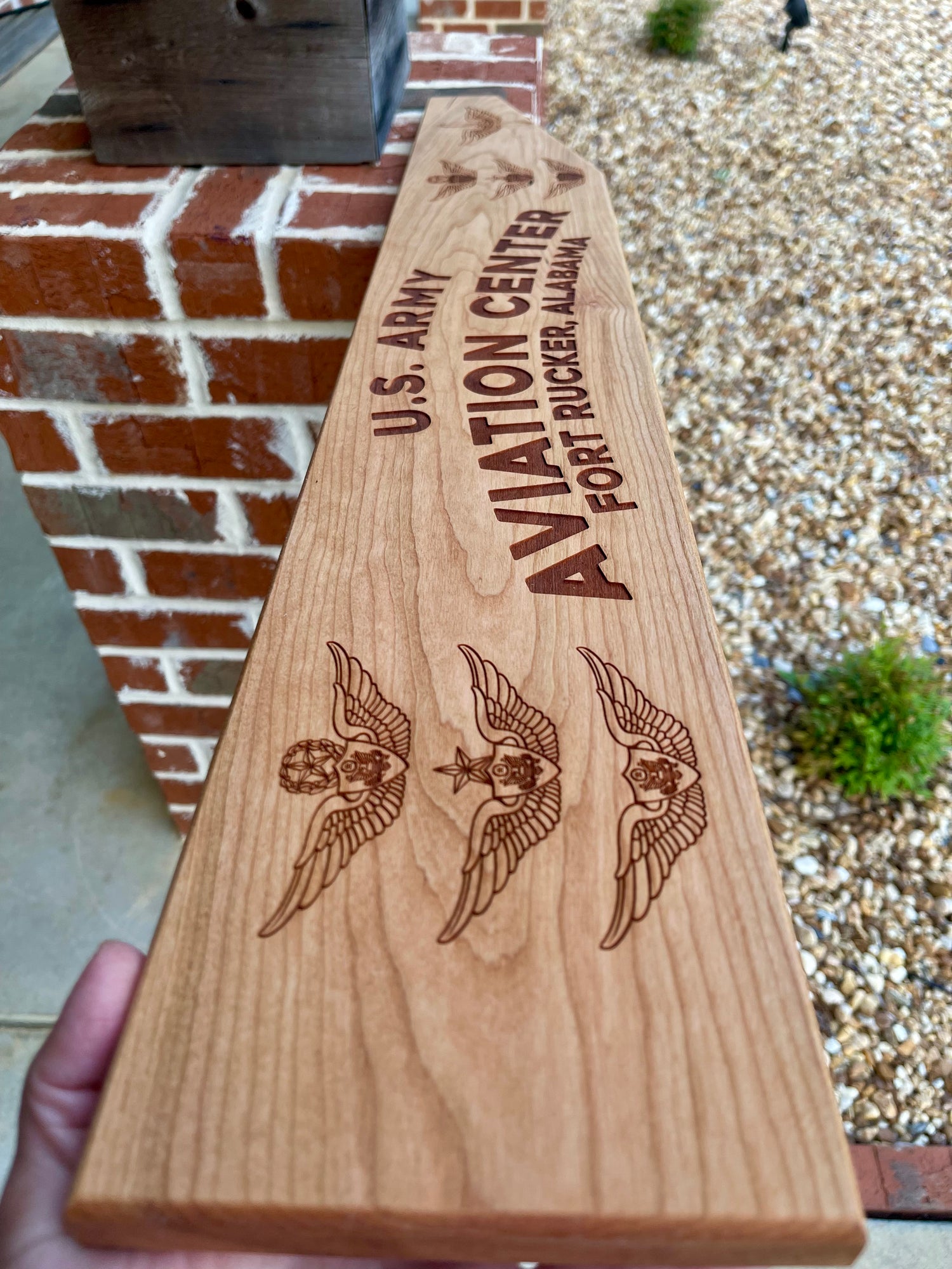 Expertly crafted from thick, durable kiln dried wood this elegantly designed piece makes an exceptional going-away gift. Featuring precision-cut acrylic lettering, it comes ready to hang for effortless display. Fort Rucker Aviation Center we will remember always. A distinguished gift choice for aviation and military professionals. DISCLAIMER: not all variants of wood grains are exactly the same and may look a little difference in appearance. Each select piece will be picked with prestidge in appeal.