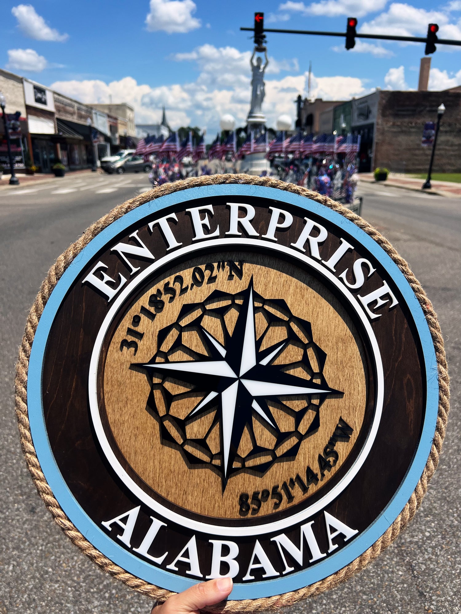 Proudly featuring the exact coordinates of the Boll Weevil Monument — 📍 31.3158° N, 85.8552° W — this 15" sign is more than decor. It's a tribute to the strength, grit, and pride that defines Enterprise, Alabama.