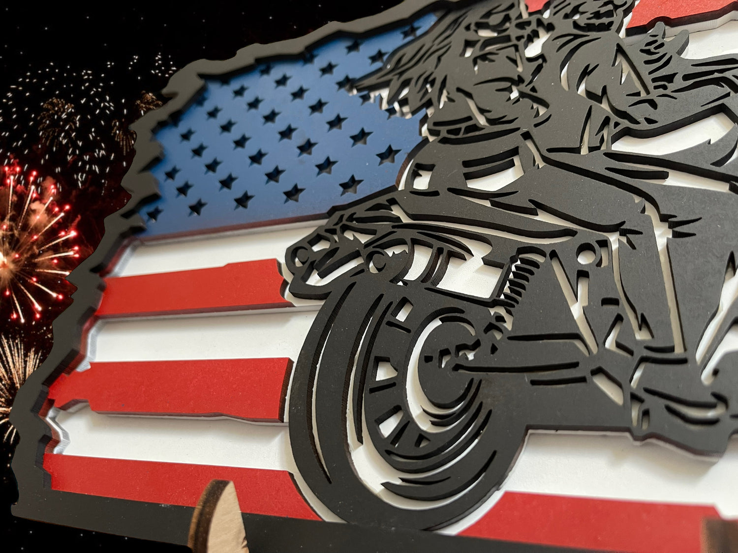 Celebrate your patriotism with 'Merican Lovers Mandala! This layered art piece features two lovers on a motorcycle and the iconic American Flag for a dramatic effect. A perfect décor solution for any proud American!