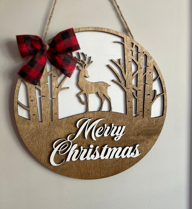 This "Merry Christmas" Wall Hanger is perfect for festive holiday decorating. Laser engraved and crafted with premium plywood, the signage is stained and painted to add classic elegance. The red and black plaid bow and deer in the woods engraving complete the look, adding a touch of traditional holiday charm.